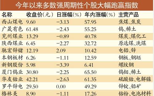 今年以來,在政策預(yù)期以及產(chǎn)品價(jià)格上漲的刺激下,煤炭、鋼鐵和有色等開啟了一輪行業(yè)牛市,如西山煤電今年以來累計(jì)上漲57.96%,兗州煤業(yè)上漲40.78%,廣晟有色上漲55.25%。另外,陜西煤業(yè)、大同煤業(yè)、盤江股份等都表現(xiàn)不錯(cuò)。但近期這些板塊有回調(diào)跡象,有色板塊跌幅較大,達(dá)到1.35%,金貴銀業(yè)、中色股份、華友鈷業(yè)等跌幅居前。